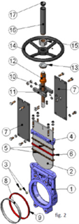 Уплотнение «металл/эластомер со скребком ножа». 100% герметичность, уплотнение зафиксировано внутри корпуса, металлическим скребком, который защищает седловое уплотнение задвижки от износа и очищает нож, если рабочая среда содержит твердые частицы и отложения налипающие на нож.